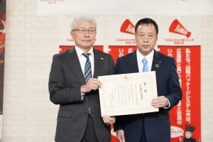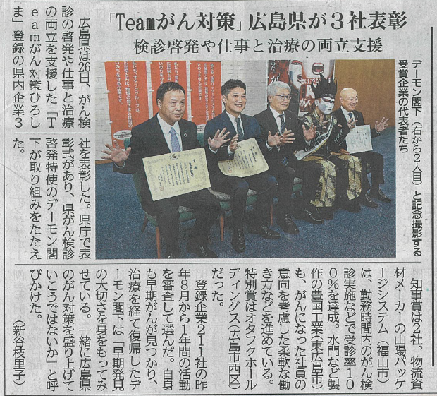 この度の表彰は、これらの取り組みが「正しい方向に進んでいる」という「証」として、社員一同大変ありがたく感じております。しかしこれは、私たちのゴールではなく、さらなるスタート地点である、と考え、今後も、社員の健康を最優先に考え、より良い職場環境を築いてまいります。最後に、がん対策への取組の機会を下さった県庁職員の皆様、そしてこの取り組みに協力して頂いた専門医の先生方、又、全ての社員に感謝の意を表します。社員の努力があってこそ、このような成果を得ることができました。